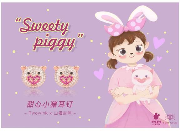 甜心小猪是Twowink推出的首款甜心萌宠系列首饰,Twowink品牌的DNA元素是心形,在这款首饰中爱心元素巧妙地融入可爱小猪造型中,甜心系列首饰的主要元素是软萌小动物和爱心粉嫩心形元素的结合。
