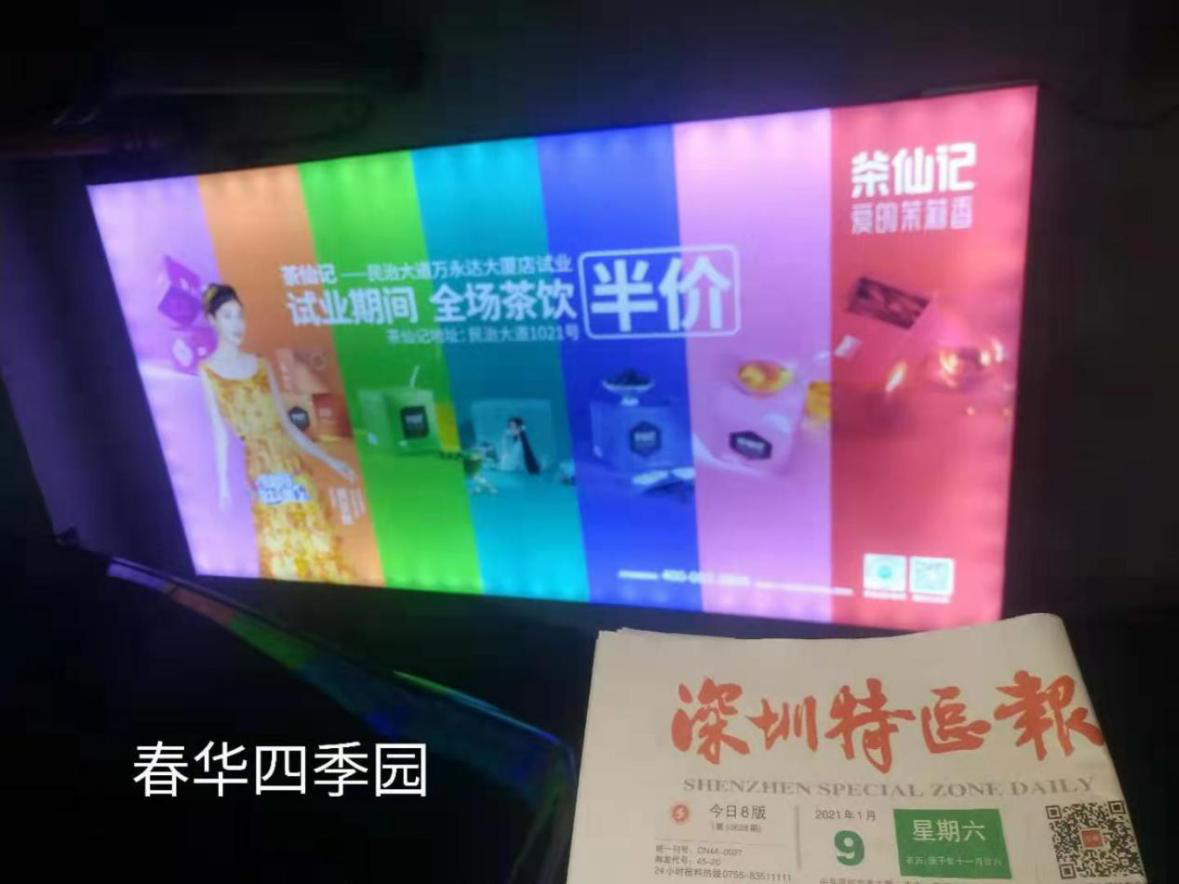 2021年1月16日,深圳龙华区创兴时代、合正中央原著、鸿荣源·尚峻、金地上塘道花园、锦绣江南二期、星河传奇一期、星河传奇二期、星河传奇三期、银泉花园、中海锦城、幸福城二期、东华明珠园、福景花园、弘诚阁小区、金庸阁二期、康华苑、优品建筑、龙岸花园、春华四季园各大小区门禁与地下停车场都能看到茶仙记的身影。茶仙记试业优惠广告27个站点齐发,红遍龙华!
